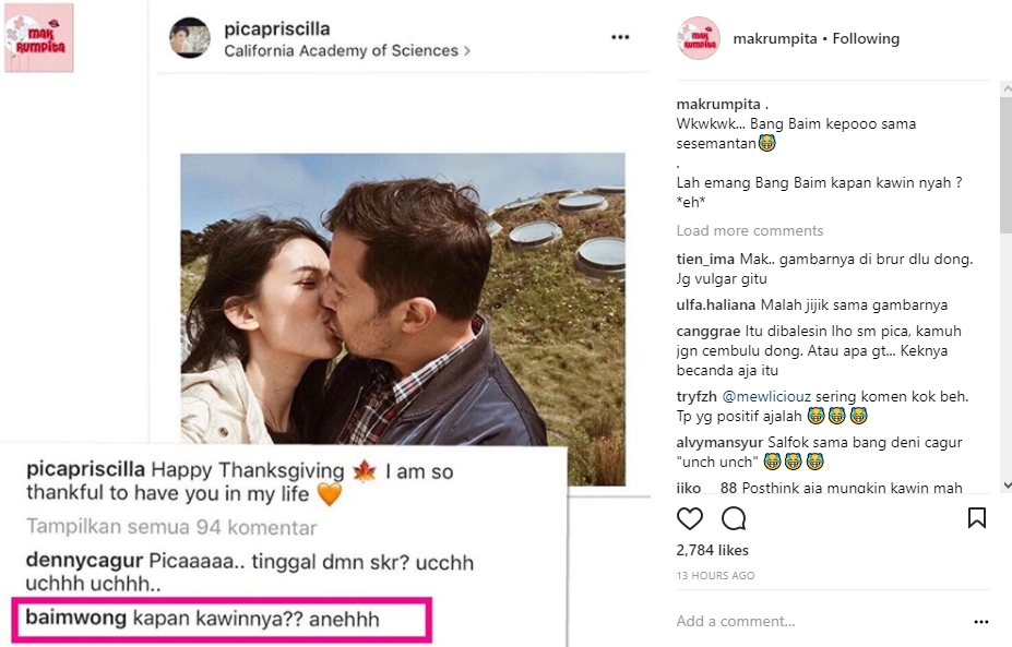 Postingan itu pun menuai berbagai komentar dari publik. Namun, siapa sangka jika Baim yang hubungannya dengan Vebby Palwinta masih meninggalkan tanda tanya itu tampak antusias meninggalkan komentar di laman Instagram Pica. Baim bahkan blak-blakan saat menyinggung soal pernikahan. "kapan kawinnya?? anehhh," tulis Baim.