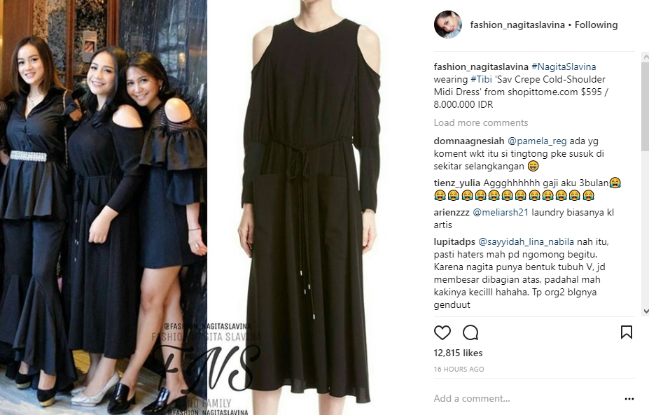 Siapa sangka, meskipun tampak sederhana, pakaian yang dikenakan Gigi itu dibandrol dengan harga cukup mahal, yakni Rp 8 juta. "#NagitaSlavina wearing #Tibi 'Sav Crepe Cold-Shoulder Midi Dress' from shopittome.com $595 / 8.000.000 IDR," tulis akun @fashion_nagitaslavina dalam keterangan postingannya, Kamis, 23 November.