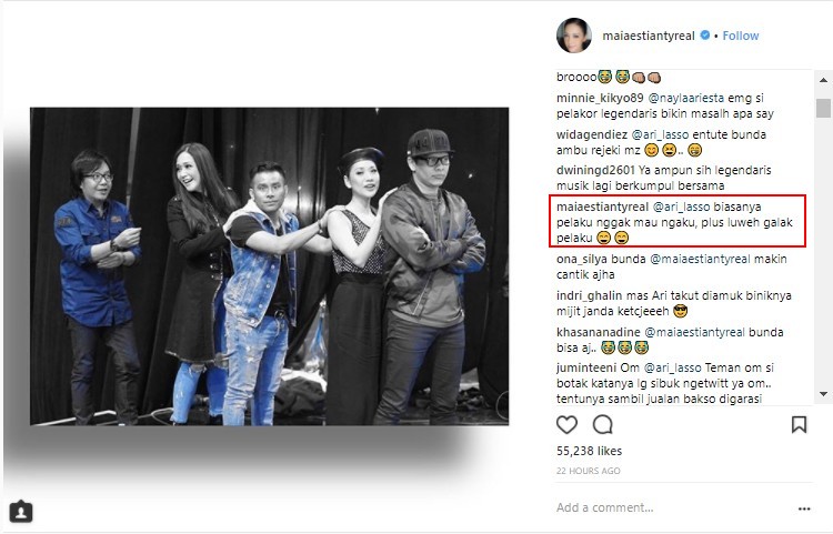 "Bunda @maiaestiantyreal kalo ngomong suka bener ae, Pelaku ya bun bukan Pelakor," tulis @ri***hh. "@ari_lasso hahahaha bunda @maiaestiantyreal klau bisa harus lebih galak lagi bun biar sibabu kagk seenak jidatnya membenarkan tingkah lakunya sebagai pelakor legenda," imbuh @n***esta. "Jangan disindir sindir lagi bund @maiaestiantyreal pelakornya,ntr dikira bunda sakit ati pengen balikan, jangan ya bund,jangan balikan rugiiiiiiiiiiiiiiiiiiiii," timpal @dew*****hara.