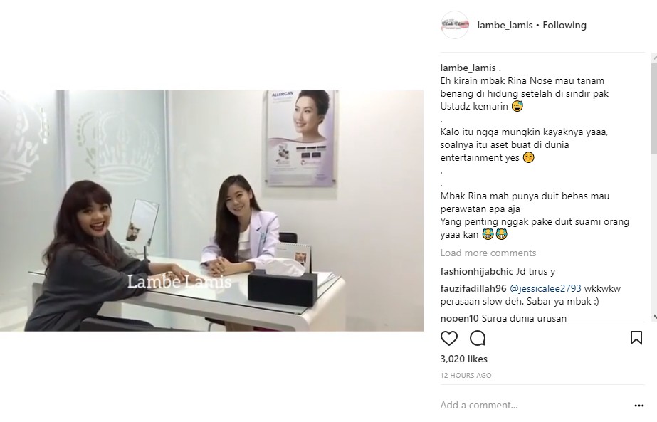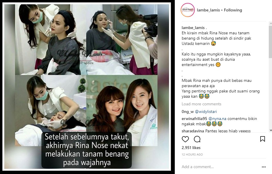 Sontak, postingan tersebut pun menuai berbagai komentar netizen. Alih-alih mendapat dukungan atau pujian, tak sedikit netizen jsutru melayangkan cibiran pada Rina Nose. Bahkan, mereka juga menyindir soal hidung Rina.