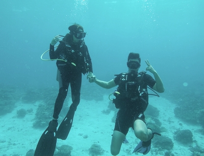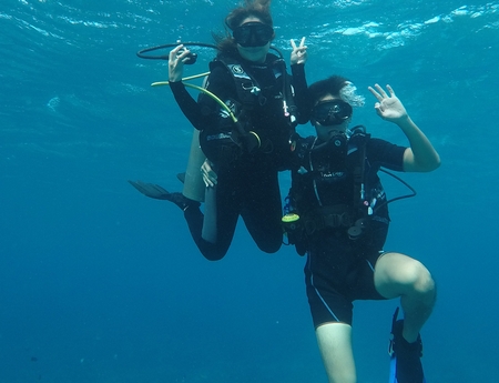 Kegiatan liburan mereka diisi dengan bersantai lalu kemudian menyelam bersama seperti ini.