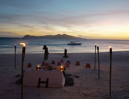 Liburan pun dilanjutkan dengan kegiatan romantis, yakni makan malam di pinggir pantai lengkap dengan lilin temaram.