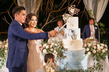 Pasangan ini juga memotong kue pernikahan berwarna putih dan biru yang nampak cantik dihidangkan.