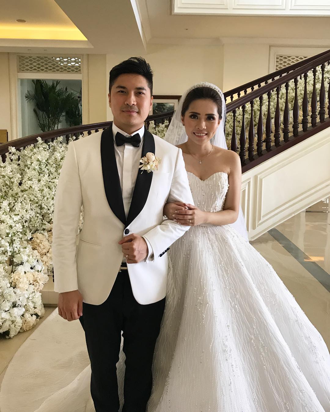 Elie sendiri nampak anggun dibalut gaun cantik dari designer Hiantjen dimana sang suami mengenakan jas karya Agus Lim.