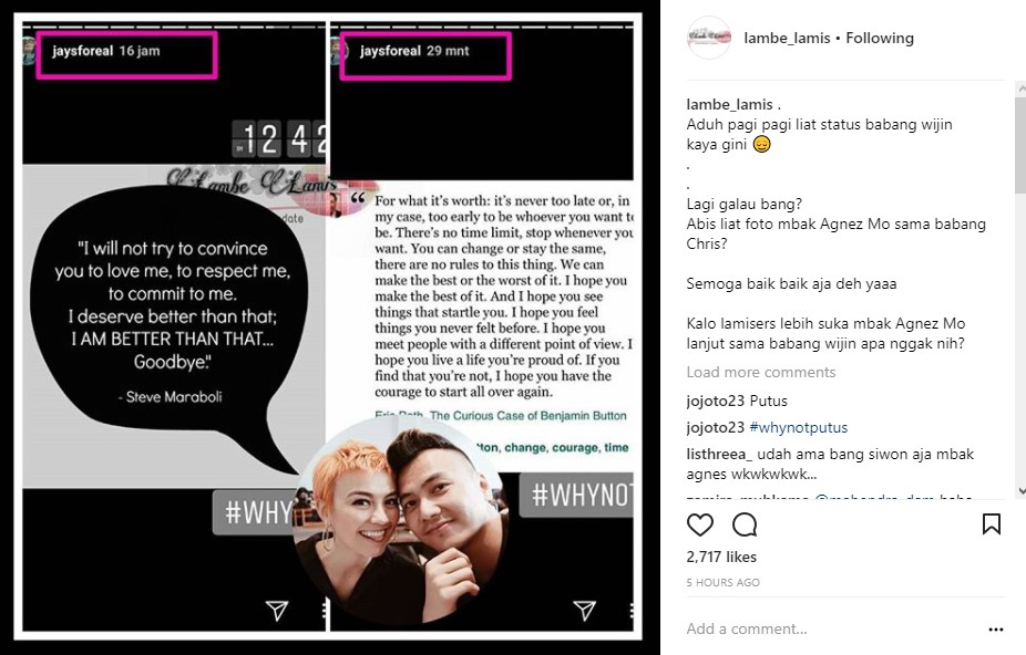 Usai Wijaya Saputra membagikan kutipan kata-kata galau melalui akun sosial media, netter berharap Agnes monica putus dari kekasihnya itu. Kenapa?