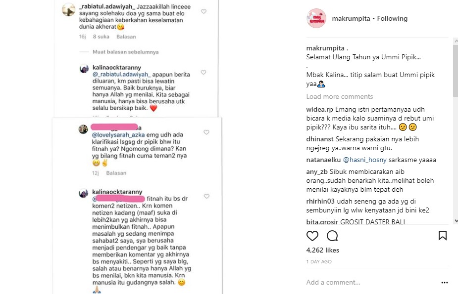 Tak sampai disitu, Kalina pun memberi dukungan pada Umi Pipik terkait fitnah yang tengah menimpa sahabatnya itu. "apapun berita diluaran, km pasti bisa lewatin semuanya. Baik buruknya, biar hanya Allah yg menilai. Kita sebagai manusia, hanya bisa berusaha utk selalu bersikap baik," tulis Kalina dalam balasan komentarnya pada Pipik.