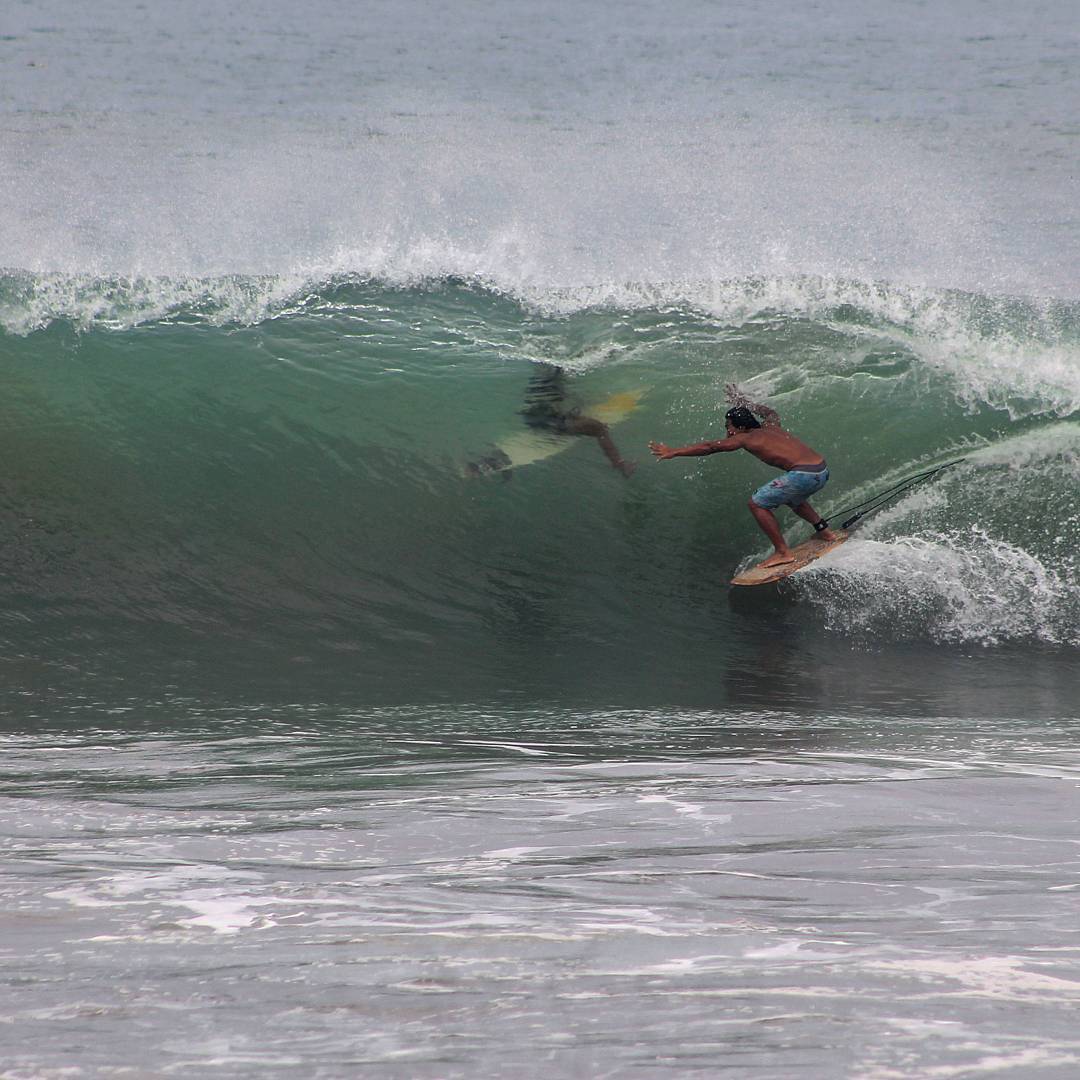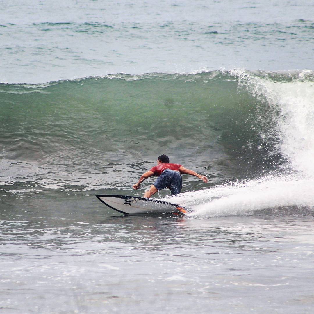 Tak ada rasa takut, pria berumur 37 tahun itu dengan gagahnya menerjang ombak 'hanya' dengan papan seluncur.