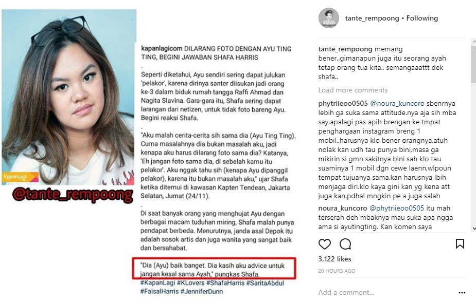 Sebelumnya, Shafa bahkan sempat berpose dengan Ayu Ting Ting. Namun, larangan justru dilayangkan netizen padanya lantaran menilai Ayu Ting Ting sebagai "pelakor" alias perebut laki orang. Seperti diketahui, Ayu Ting Ting kerap disebut sebagai orang ketiga dalam rumah tangga Raffi Ahmad dan Nagita Slavina.