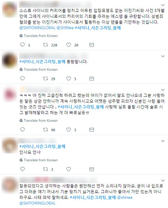 Sebagian fans yang melakukan aksi boikot penjualan Season Greeting SHINee membuat hastag #BOIKOT_SEASON_SHINEE termasuk beberapa Tweet seperti “Kami memboikot semua kegiatan SHINee yang mengikutsertakan Onew”, “Aku tak akan membelinya”, “Menjual tanpa memberitahukan detail barang secara jelas adalah penipuan”, “Kehadirannya hanya akan membuat fans lain kecewa” di akun Twitter mereka masing-masing. Tetapi, hal ini berbanding terbalik dengan reaksi dari fans diluar Korea yang menyambut gembira dan lega dengan kembalinya Onew.