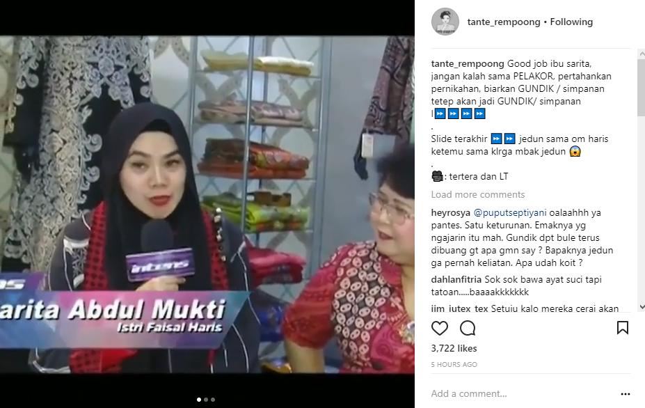 Mengetahui postingan yang diunggah ulang oleh akun gosip @tante_rempoong, tak sedikit netizen mendukung keputusan Sarita. "Harus bertahan !!! Klw ga bertahan keenakan si pelakor!!!" seru @rill*****ri95. "Setujuuuuuuu.... kalo cerai pelakornya bisa pesta pesta 7 hari 7 malam.. open billll bundooo. Do it for your baby baby yg blaem blaem..." kata @p****_buk_inoen. "mendukung keputusan bijak bunda @queen_saritaabdulmukti," imbuh @ratna_****la_shinta.