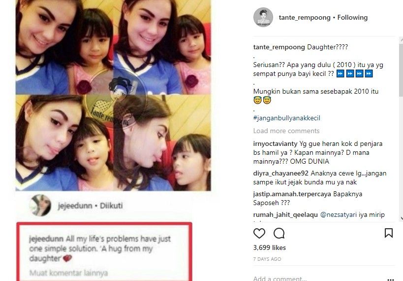 Melalui postingan akun gosip @tante_rempoong, tampak bocah perempuan yang sudah tumbuh besar berpose dengan Jennifer Dunn. Siapa sangka, Jennifer Dunn justru mengakui jika bocah tersebut adalah putrinya. Seakan menguatkan dirinya sendiri, Jennifer Dunn pun mengungkapkan bahwa pelukan sang putri adalah solusi dari semua permasalahannya.