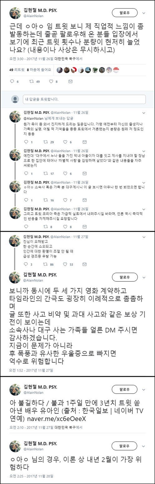 Melalui akun Twitter miliknya, belum lama ini psikiater Kim Hyun Chul ternyata beberapa kali menuliskan komentarnya mengenai perilaku Yoo Ah In. Bahkan, psikiater tersebut juga sempat mengungkapkan kekhawatirannya terhadap kesehatan mental sang aktor.