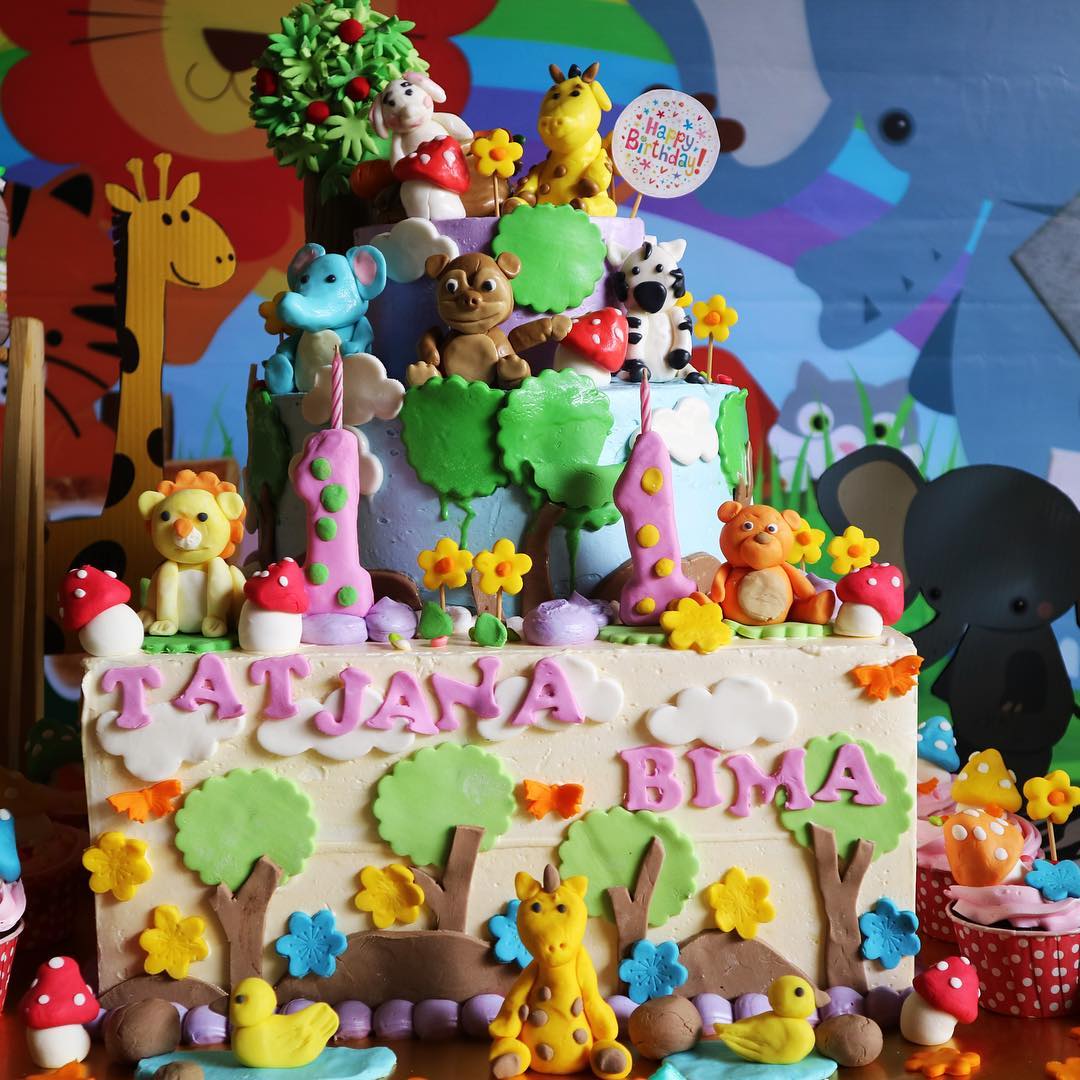 Ulangtahun sederhana itu mengusung konsep kebun binantang lengkap dengan dekorasi berupa binatang-binatang. Tak terkecuali kuenya yang 'rame' ini.