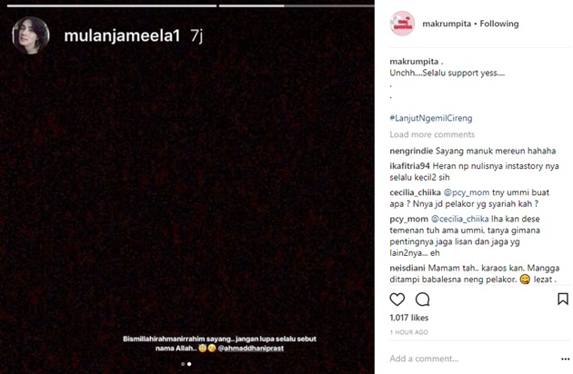 Perkara yang menjerat Dhani tersebut tak pelak juga menjadi perhatian sang istri, Mulan Jameela. Tak ingin berdiam diri begitu saja, penyanyi cantik tersebut juga menunjukkan dukungannya untuk suami. Melalui Instagram Storiesnya baru-baru ini, Mulan menuliskan pesan manis untuk Dhani.