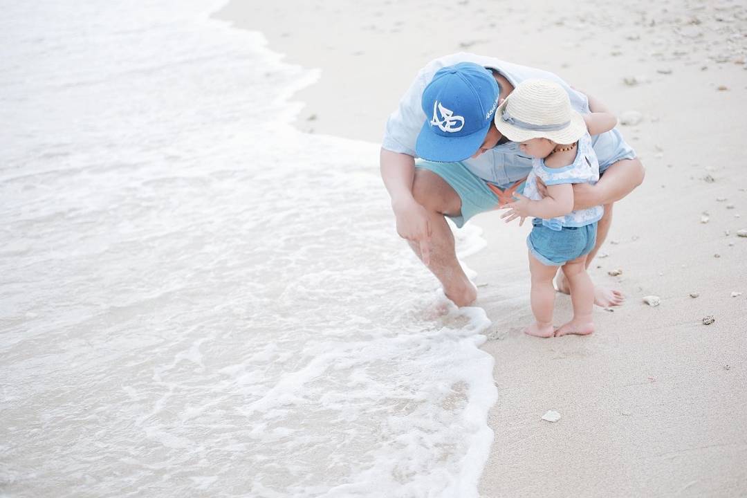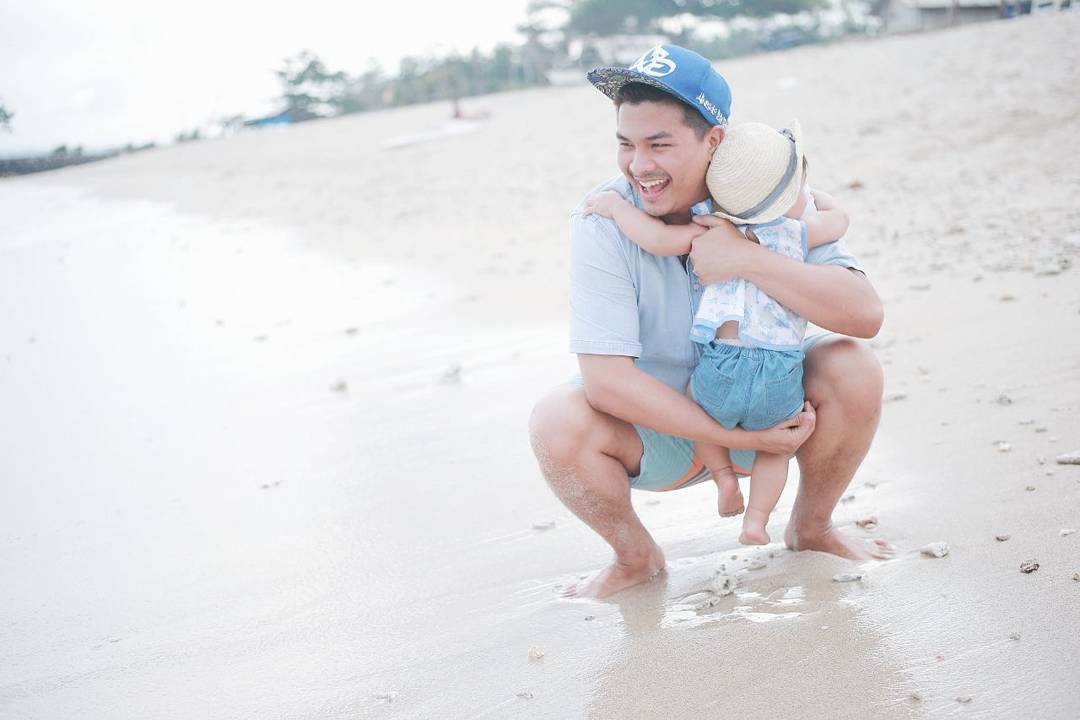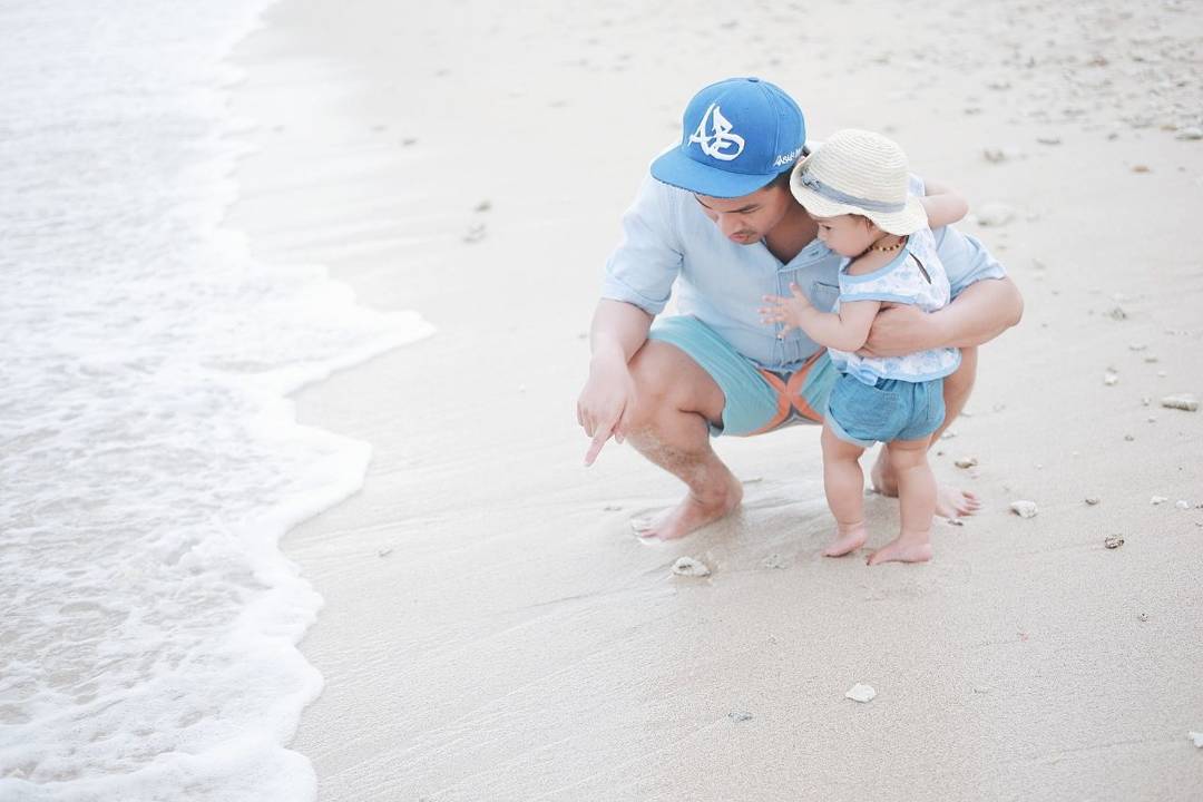 Pertama kali 'kenalan' dengan pantai dan ombak, Nastusha sedikit ketakutan hingga langsung memeluk daddy-nya seperti ini.