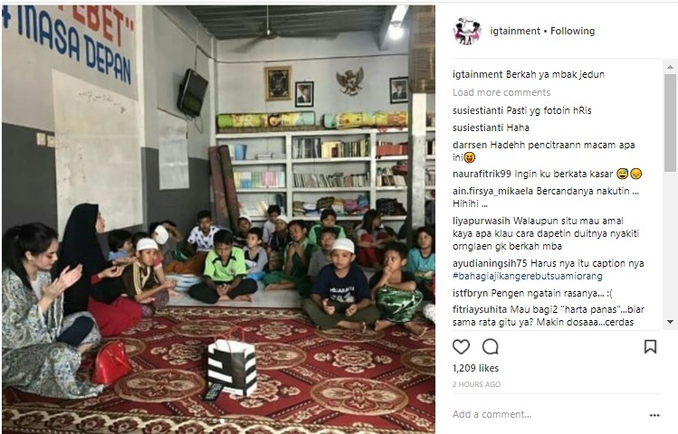"Walaupun situ mau amal kaya apa klau cara dapetin duitnya nyakiti ornglaen gk berkah mba," ujar @li****asih. "Pgn nya si berbagi berkah, lah alhasil dari uang yg bukan dari hasil keringat alias dari hasil valakor yaa, kasihan bukan nya malah yg dikasih dapat berbagi dosa dosa nya dia.. Yaa(moga aja berkah)jedun..," imbuh @a***ri "Ya Ampyun ikut2 sok agamais, aduh ga pantes shayy..... duitnya hasil dr mana shayy....," kata @ri***rina. "Mau buat pecintraan apapun itu gak bakall dicap baik lho jedun, sampe neraka pun sampe mati seindonesia gak bakall lho di ampuni," timpal @if***9.