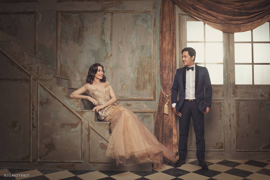 Andre dan sang istri menggandeng fotografer Rio Motret dan memilih konsep elegan dengan kompak mengenakan perpaduan antara gaun dan tuxedo.