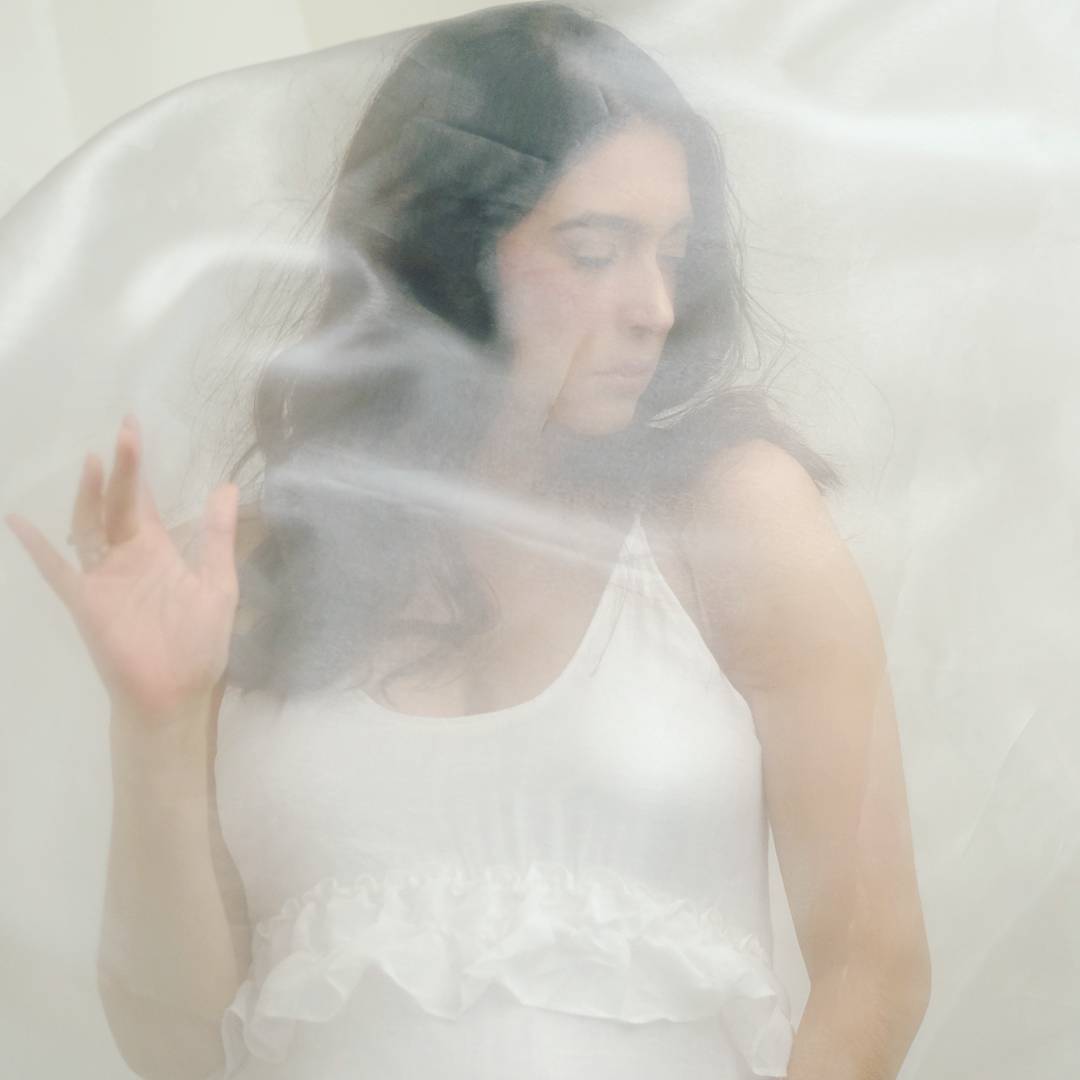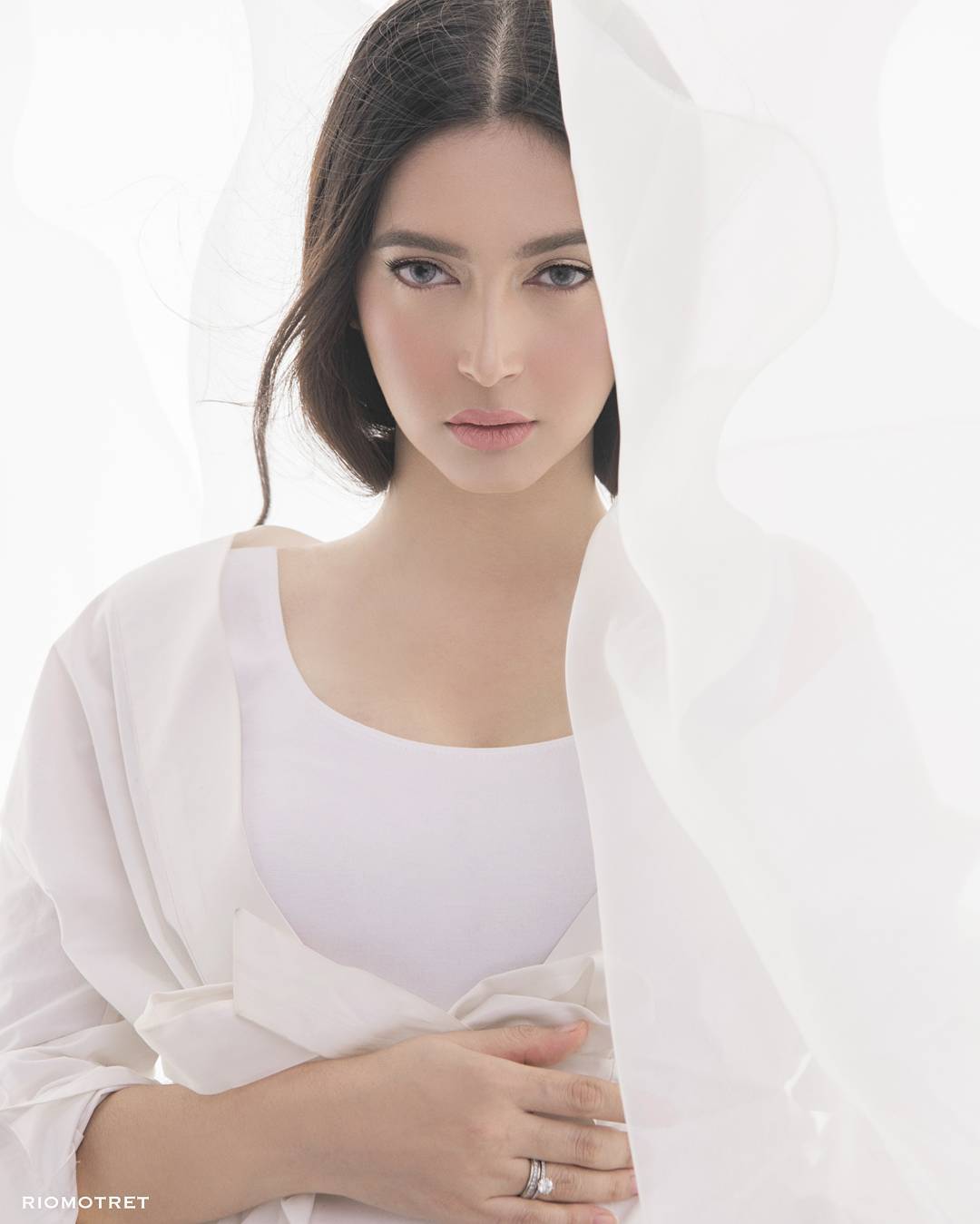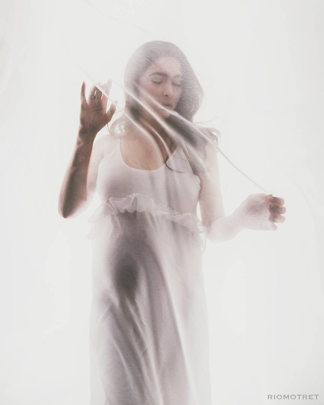 Masih bernuansa putih, pemotretan kali ini menambah property berupa kain transparan yang membuatnya artistik.