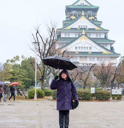 Dinginnya musim di Jepang juga tak menghalangi mantan istri Wishnutama itu untuk berpose manja di depan Osaka Castle lho!