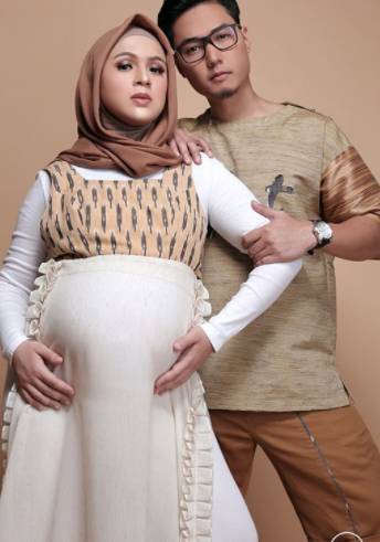 Keduanya kompak memilih warna coklat sebagai busana pemotretan mereka. Tambahan desain etnik memberikan efek elegan dalam pemotretan keluarga ini bukan?