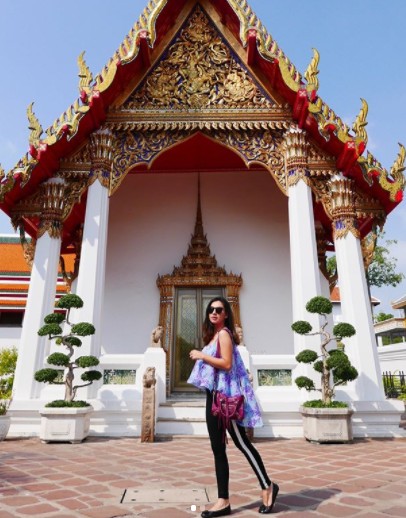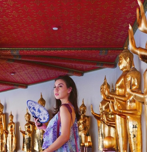 Bella mengunjungi beberapa lokasi wisata, salah satunya adalah Wat Pho Temple yang berada di pusat kota, Bangkok, Thailand.