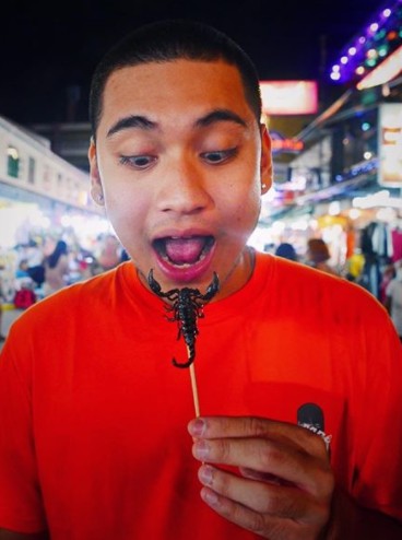 Salah satu lokasi pusat kuliner di Thailand adalah jalan Khao San, Gino pun menjajal makanan ekstrim berupa kalajengking goreng. Enak?