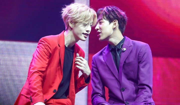 Pada acara fan meeting, Mark tampil kece dengan setelan formal berwarna merah. Di sampingnya, tampak sosok Bambam yang tampak keren dalam balutan setelan formal serupa, tapi berwarna ungu.