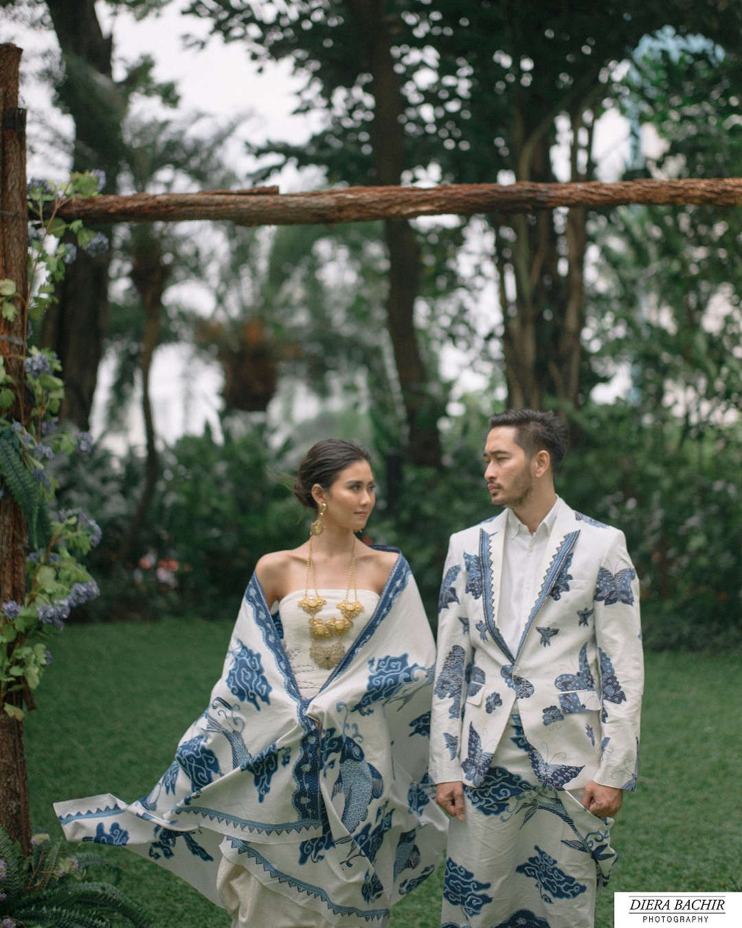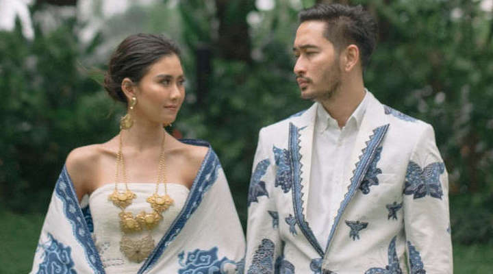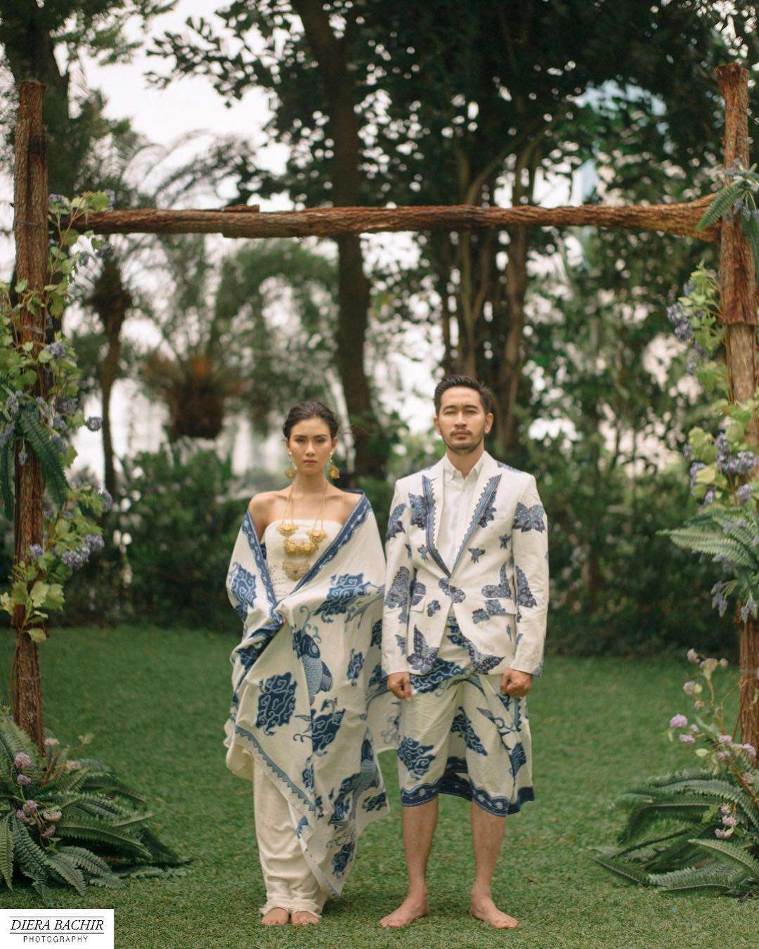 Pasangan artis dan musisi ini kemudian didandani dengan busana bercorak batik yang berwarna seperti awan, yakni putih dan biru.