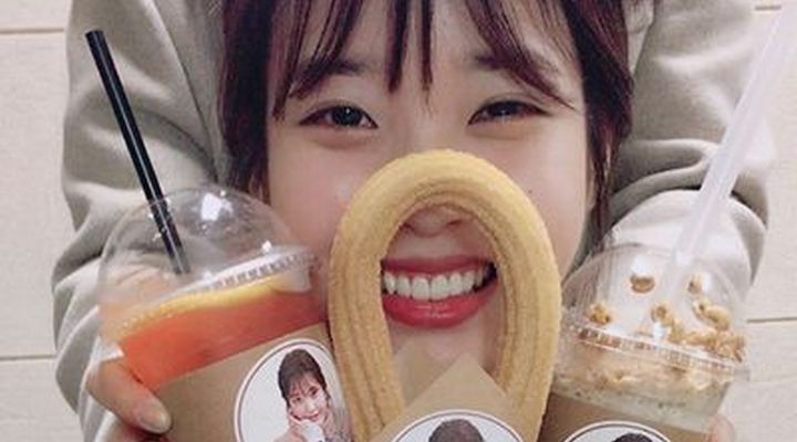IU memamerkan foto-foto imut bersama makanan dan minuman yang dikirimkan dua temannya ini di lokasi syuting.