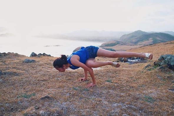 Di atas bukit serta pemandangan laut, Liza Elly tuntukkan kekuatan tangannya dengan gerakan yoga.