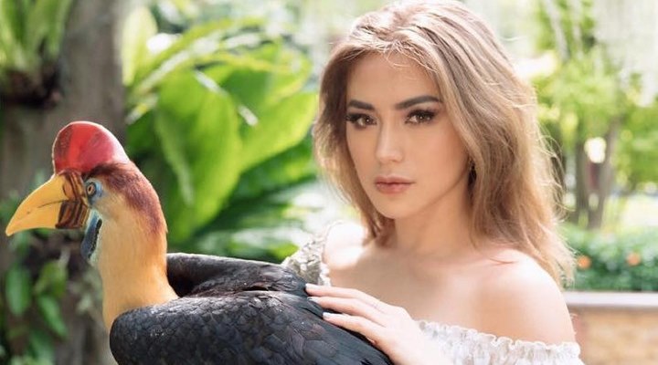 Tidak hanya cantik, Jedar juga ibu yang pemberani. Ia berfoto dengan salah satu burung dari Sulawesi, Enggang Rangkong. Jedar tetap tampil seksi dengan memamerkan bahu dan perut mulusnya.