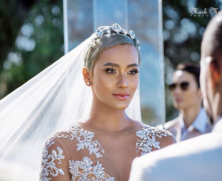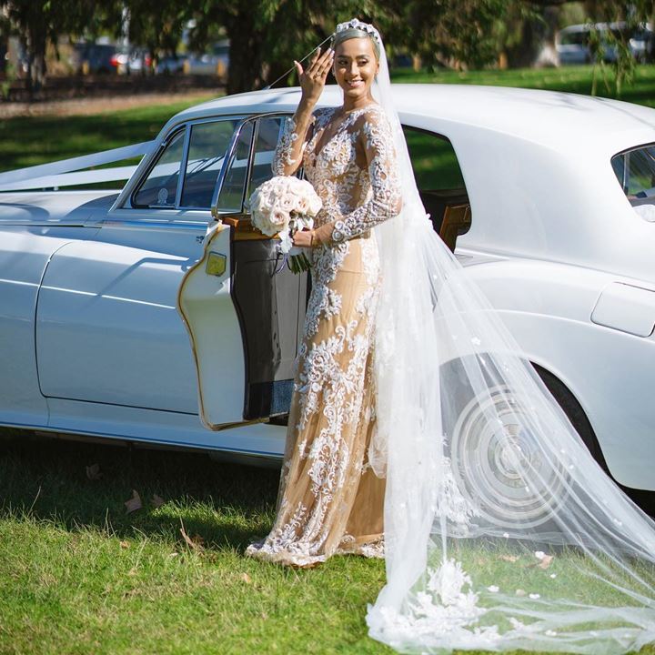 Dalam foto ini, gaun Kimmy tampak lebih jelas. Ia pun terlihat bahagia memamerkan cincin pernikahannya sambil membawa buket bunga mawar putih di tangannya yang lain.