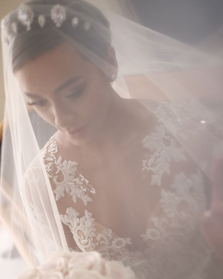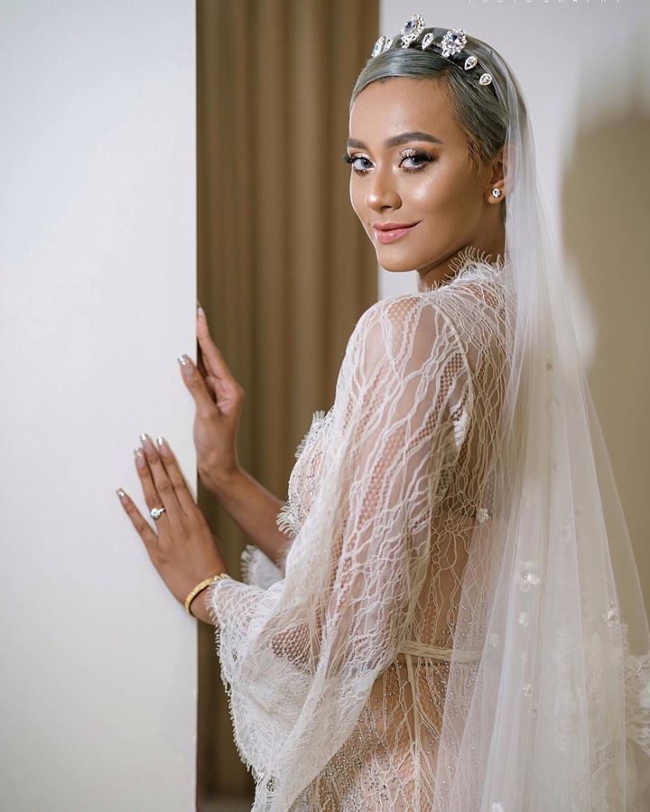 Dalam foto ini, Kimmy terlihat lebih anggun. Ditutupi kerudung putih transparan, ia tampak menghayati momen sakral pernikahannya.