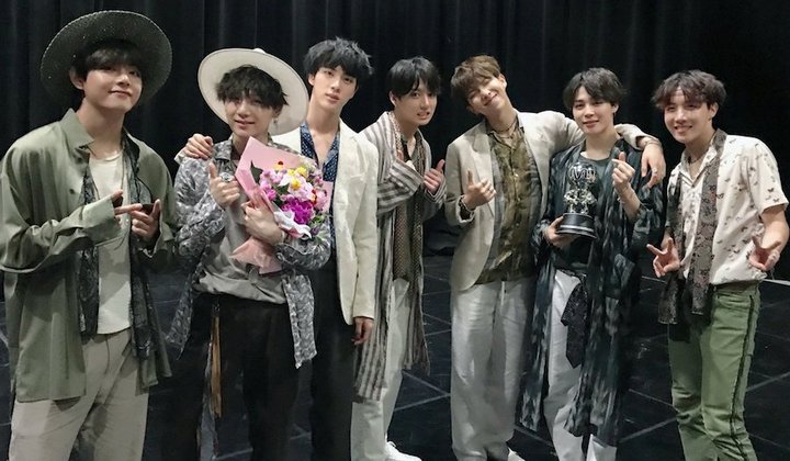 Ketujuh member Bangtan Boys pun berpose bersama bunga dan piala kemenangan mereka. Tak lupa senyum lebar juga terlihat di wajah para member Bangtan Boys baik di panggung maupun dibelakang panggung.