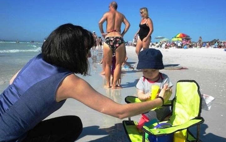 Foto yang ini kocak banget ya jadinya. Seorang wanita yang sedang membungkuk membuat pria di depannya terlihat memakai bikini