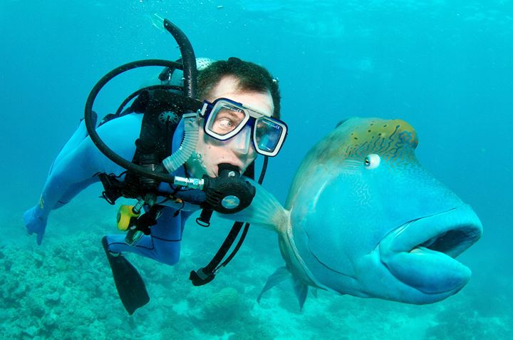 Foto yang ini kocak banget deh. Seekor ikan tampak kaget sampai melotot melihat penyelam di sampingnya.