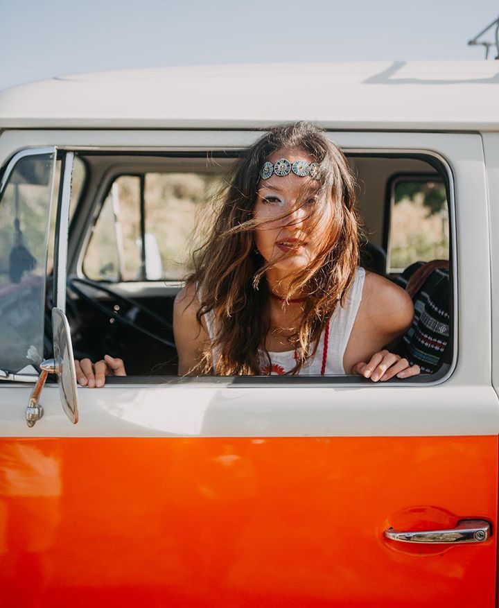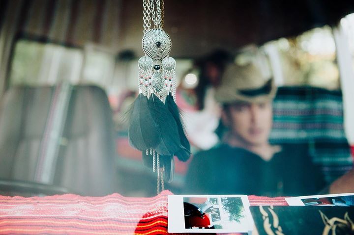 Sosok Dimas tampak blur dalam foto ini. Gantungan dan kain di dasbor mobil sangat kental dengan unsur bohemian ya.