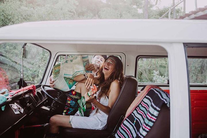 Foto pra nikah yang Nadine dan Dimas mengambil tema Hippies-bohemian. Tampak pernak pernik lucu khas bohemian di dalam mobil maupun yang dikenakan pasangan ini.