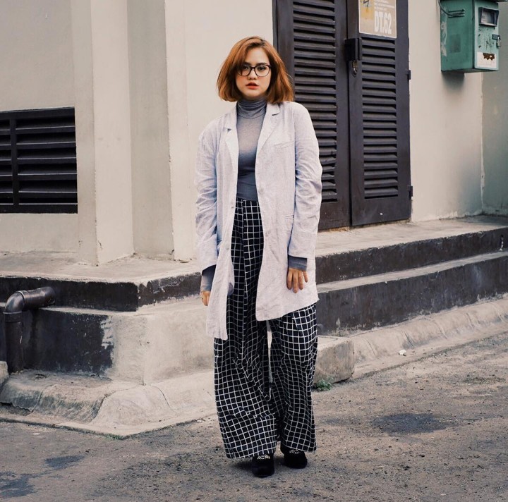 Meski memiliki tubuh yang tak tinggi, Mytha memadukan celana kulot dan outer abu-abu yang tampak serasi. Untuk dalamannya, ia memilih mengenakan kaus panjang bermodel turtle neck