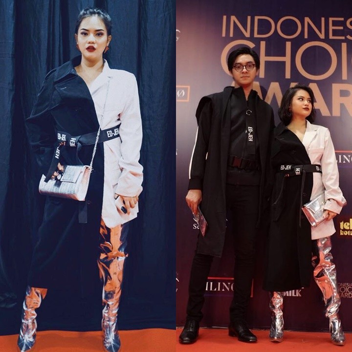 Mytha juga bisa keren banget dengan tema hitam putih dan riasan sangar ala rocker. Sepatu bot tinggi berwarna silver melengkapi penampilannya di Indonesian Choice Awards 2018.