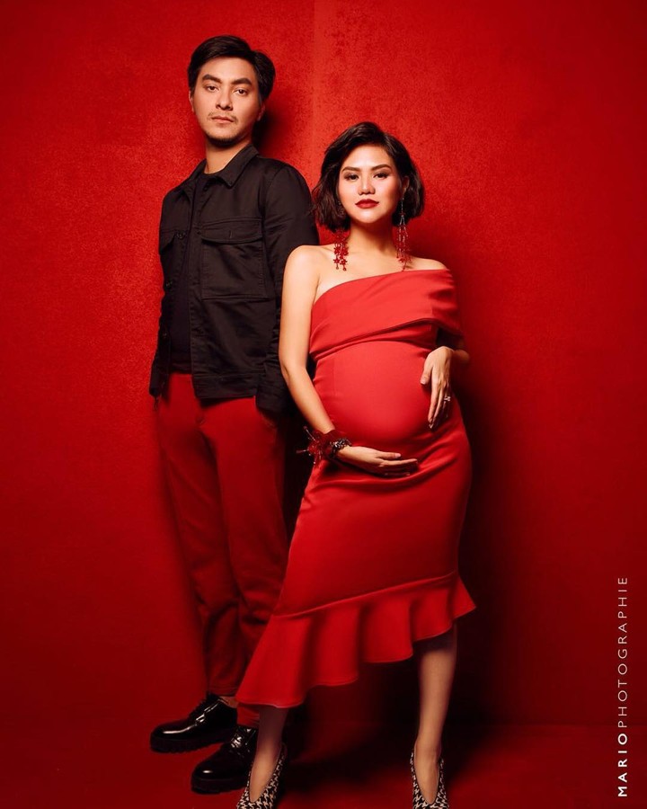 Dalam salah satu foto maternity-nya, Mytha mengenakan gaun merah ketat yang lagi-lagi menonjolkan baby bump. Lengkap dengan anting dan setapuhak tinggi warna senada, ia terlihat sangat elegan.