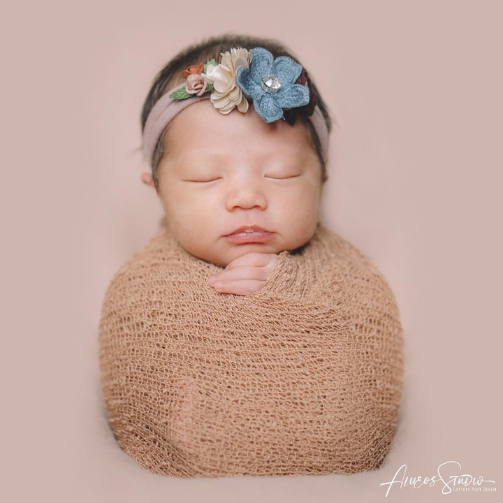 Dibalut kain berwarna coklat, Kimora jadi mirip kepompong imut. Bayi ini semakin cantik mengenakan bando bunga.