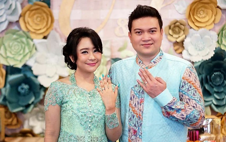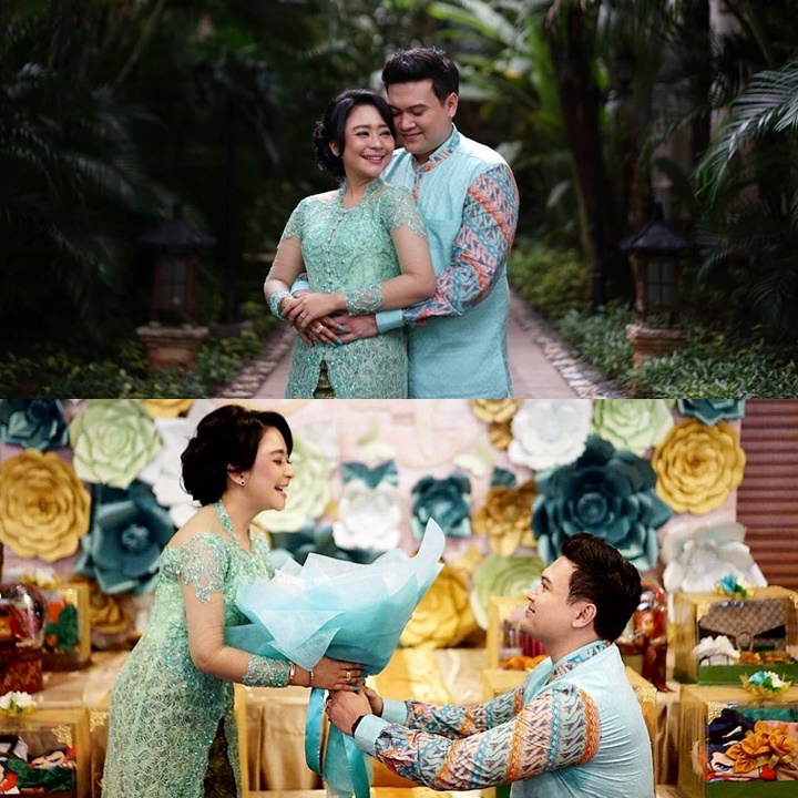 Saat hari pertunangan, pasangan ini tampak serasi mengenakan baju serba hijau. Indra terlihat berlutut memberikan bunga pada Chiquita. Romantis banget nih.