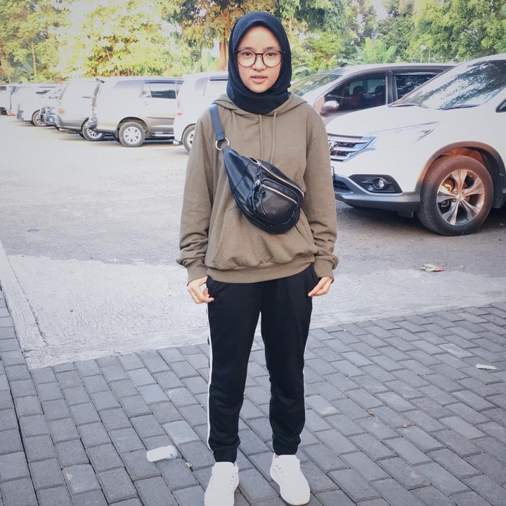 Nissa mengenakan hoodie warna krem dan dipadukan dengan ikat pinggang biru. Penampilannya jadi engga membosankan nih.