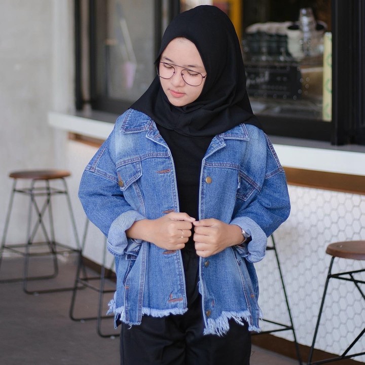 Tak hanya hoodie, Nissa juga keren dengan jaket denim nih. Ia memadukannya dengan kerudung dan kaus hitam.