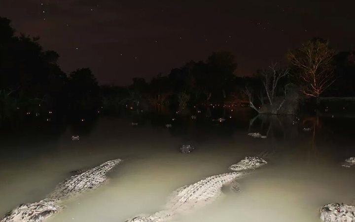Kalau kamu perhatikan, banyak sekali titik cahaya di sana. Bertanya-tanya apa itu? Itu adalah mata buaya. Waduh, fotografernya baik-baik saja, ya!