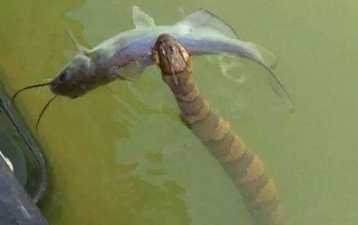 Meski bukan adegan film horor, melihat foto ini kamu bisa merinding juga kan? Lihat betapa ganasnya ular tersebut memangsa ikan.