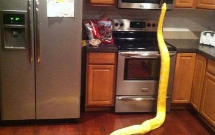 Tampaknya ular pitun ini ingin membantu menyalakan microwave di dapur. Eh, tapi yakin enggak teriak kalau melihat pemandangan seperti itu?