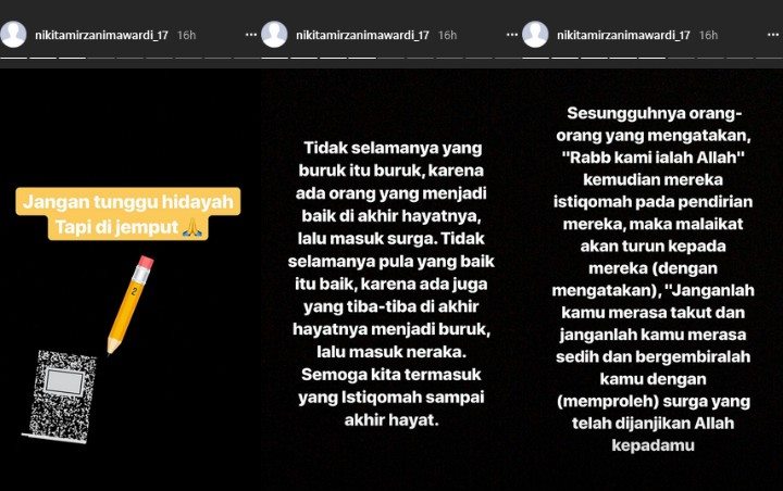 Sebelum memutuskan untuk mengenakan hijab, Nikita sempat mengunggah foto-foto yang misterius. Ibu dua orang anak ini mengunggah tulisan-tulisan yang mengisyaratkan tentang hijrahnya.