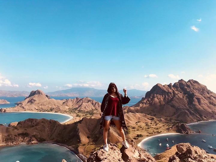 Bikin iri, Siti sudah bergaya di atas puncak Pulau Padar yang ada di kawasan Taman Nasional Komodo, nih.